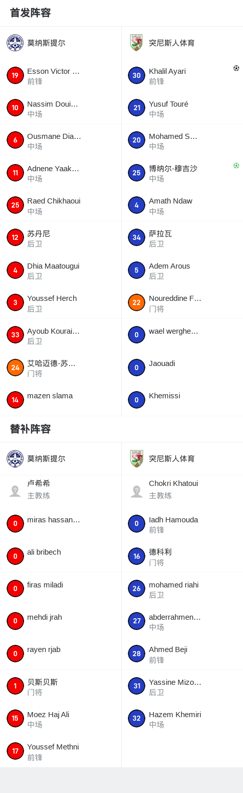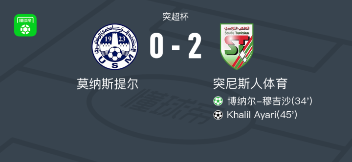 突尼斯人体育2-0莫纳斯提尔,博纳尔-穆吉沙建功,Khalil Ayari锁定胜局