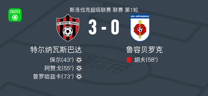 北京时间7月28日斯洛伐克超级联赛 联赛 第1轮,特尔纳瓦斯巴达主场对阵鲁容贝罗克。特尔纳瓦斯巴达保尔破门,阿赞戈破门,普罗哈兹卡破门。最终比分特尔纳瓦斯巴达 3-0 鲁容贝罗克。