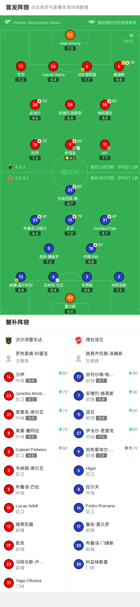 沃尔塔雷东达2-1维拉诺瓦,MV破门,伊塔洛1传1射
