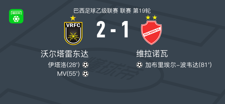 北京时间7月28日,巴西足球乙级联赛第19轮,沃尔塔雷东达坐镇主场迎战维拉诺瓦。比赛进行到第28分钟,沃尔塔雷东达球员伊塔洛率先打破僵局,帮助球队取得领先。第55分钟,伊塔洛再次建功,送出精妙助攻,帮助队友MV扩大比分优势。第81分钟,维拉诺瓦球员瓦利松-马亚送出助攻,加布里埃尔-波韦达抓住机会扳回一城。最终,沃尔塔雷东达以2比1战胜维拉诺瓦,全取三分。
