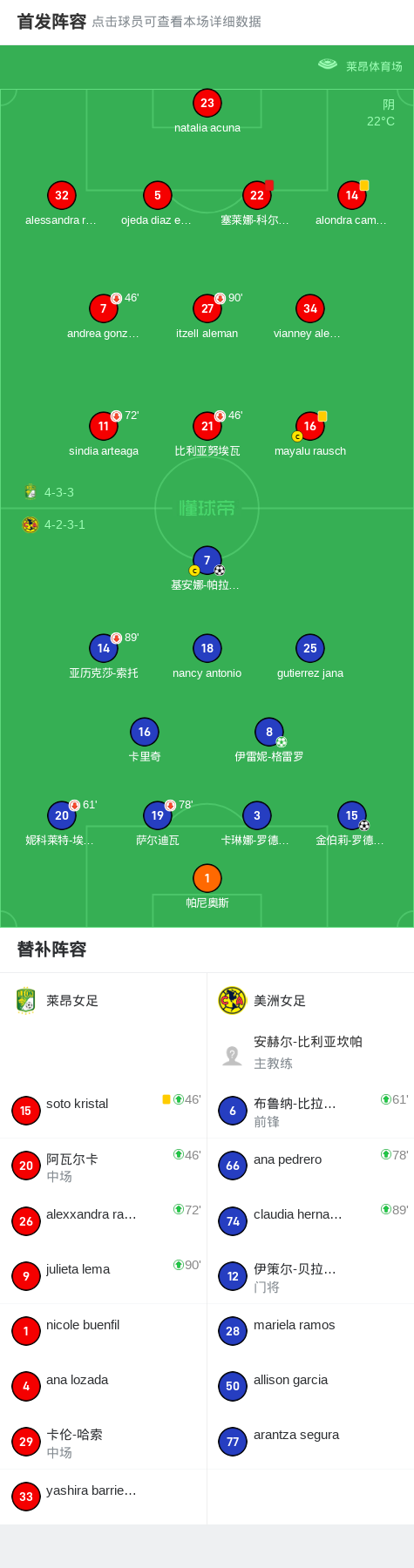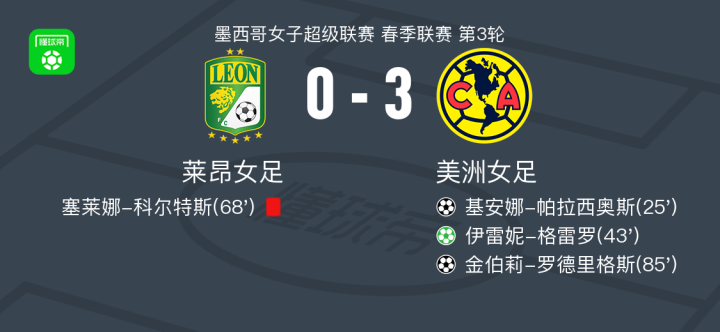 北京时间7月28日,墨西哥女子超级联赛春季联赛第3轮,莱昂女足坐镇主场迎战美洲女足。比赛中,美洲女足球员基安娜-帕拉西奥斯率先打破僵局,随后伊雷妮-格雷罗主罚点球命中,进一步扩大比分优势。比赛后段,莱昂女足球员塞莱娜-科尔特斯因犯规被红牌罚下,导致球队陷入人数劣势。终场前,美洲女足球员金伯莉-罗德里格斯再入一球,将比分最终定格在0-3。美洲女足客场完胜,全取三分。