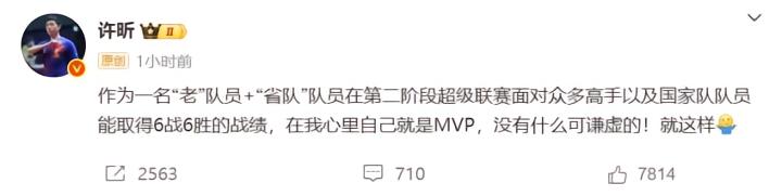 许昕:在我心里自己就是MVP,没有什么可谦虚的gaoniu @懂球帝2025-07-28 15:527月28日,乒乓球名将许昕更新社媒写道:在我心里自己就是MVP,没有什么可谦虚的。许昕发文:作为一名“老”队员+“省队”队员在第二阶段超级联赛面对众多高手以及国家队队员能取得6战6胜的战绩,在我心里自己就是MVP,没有什么可谦虚的!就这样。许昕在接受采访时,表示:没啥好总结的,所有一切都是为全运会做准备,自己在联赛中输赢看得倒是没有那么重要,自己会更多考虑双打。展开更多