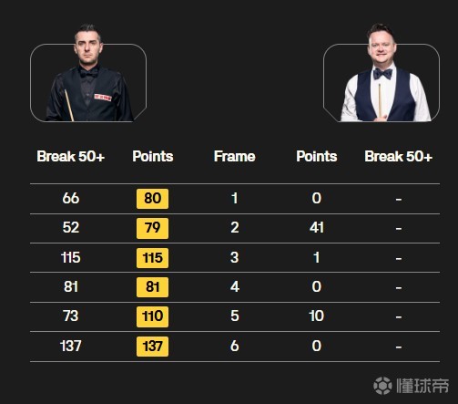 全场比赛,塞尔比手感火热,第一局和第二局他分别打出单杆66和单杆52,第三局他上演单杆115,第四局和第五局他又分别打出单杆81和单杆73,最后一局塞尔比再次打出单杆137分。