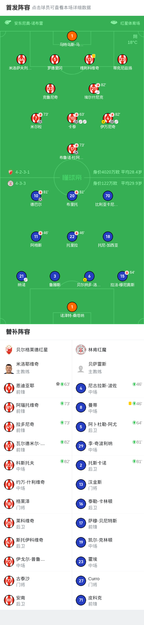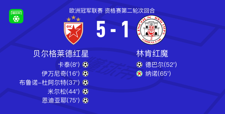 北京时间7月30日,欧洲冠军联赛资格赛第二轮次回合展开较量,贝尔格莱德红星迎战林肯红魔。比赛第8分钟,埃尔什尼克送出助攻,卡泰为贝尔格莱德红星首开纪录。第16分钟,卡泰送出妙传,伊万尼奇推射破门扩大比分。第37分钟,卡泰再次送出助攻,布鲁诺-杜阿尔特攻门得手。第44分钟,米尔松破门,为贝尔格莱德红星再添一球。上半场即以4-0遥遥领先。 易边再战,第52分钟,林肯红魔由纳诺助攻德巴尔扳回一城。第65分钟,纳诺主罚点球未能命中,错失良机。第75分钟,伊万尼奇送出助攻,恩迪亚耶攻门得手,将比分最终锁定在5-1。 次回合战罢,贝尔格莱德红星以总比分6-1淘汰林肯红魔,晋级下一轮。