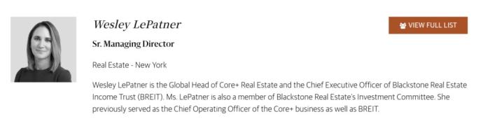 韦斯利-莱帕特纳是黑石集团核心房地产全球主管及黑石房地产收入信托基金(BREIT)首席执行官。她同时担任黑石房地产投资委员会成员。