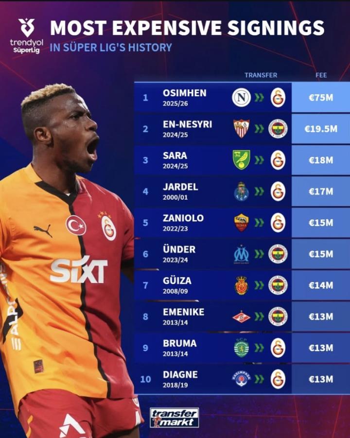 土超历史引援转会费前10:奥斯梅恩7500万欧断崖式领先