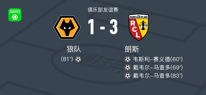 北京时间7月31日俱乐部友谊赛,狼队对阵朗斯。朗斯韦斯利-赛义德破门,戴韦尔-马查多梅开二度。最终比分狼队 1-3 朗斯。