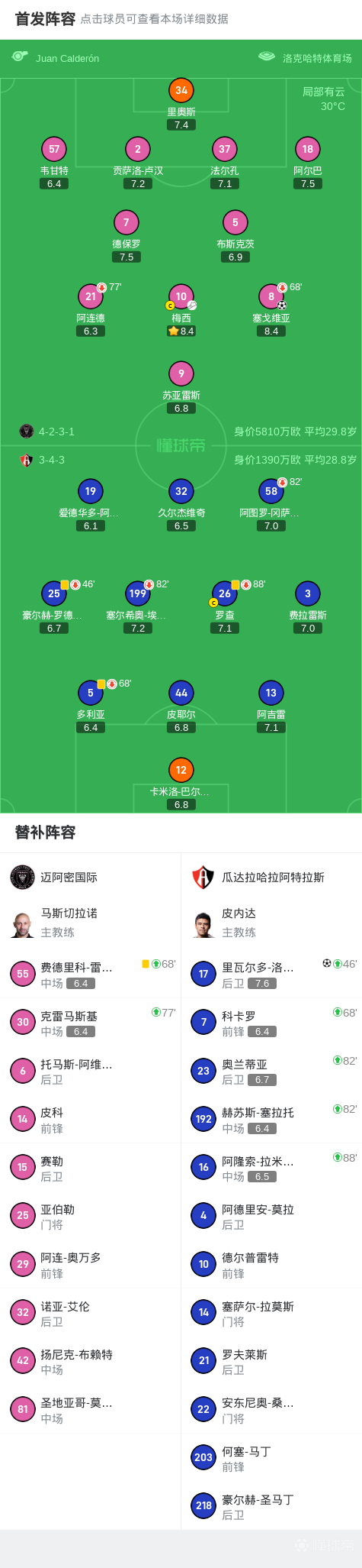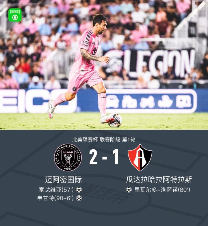 北京时间7月31日,北美联赛杯联赛阶段第1轮,迈阿密国际对阵瓜达拉哈拉阿特拉斯。梅西助攻双响并策划绝杀,塞戈维亚建功,韦甘特补时读秒破门。瓜达拉哈拉阿特拉斯里瓦尔多-洛萨诺破门。最终比分迈阿密国际2-1瓜达拉哈拉阿特拉斯。