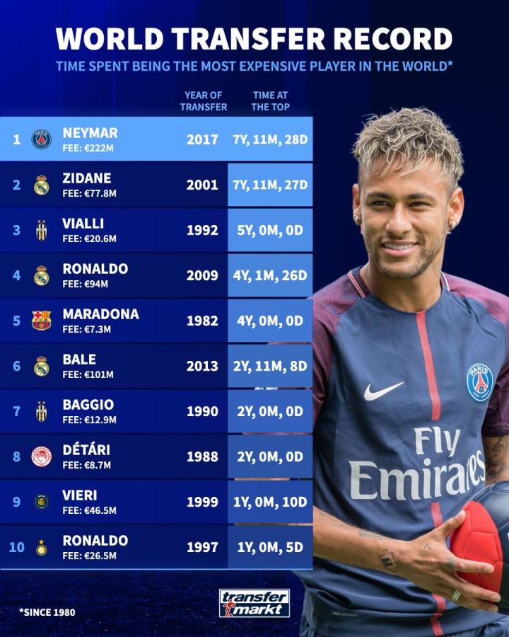 7月31日,据德国转会市场统计,内马尔在今天超越齐达内,成为自1980年以来,保持世界转会费纪录最久的球员,自2017年夏天以2.22亿欧的价格从巴萨转会加盟巴黎以来,内马尔已经保持了世界最贵转会纪录长达7年11个月28天。