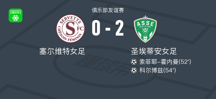 北京时间7月31日,在一场俱乐部友谊赛中,塞尔维特女足迎战圣埃蒂安女足。比赛中,圣埃蒂安女足由索菲耶-霍内曼和科尔博兹各入一球,帮助球队取得领先。最终,圣埃蒂安女足以2比0的比分取得比赛胜利。