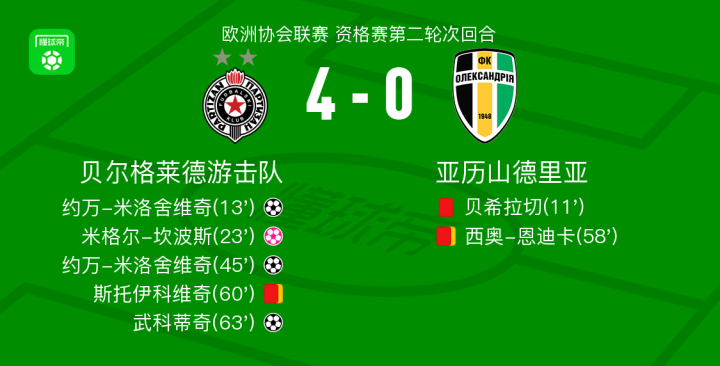 北京时间8月1日欧洲协会联赛 资格赛第二轮次回合,贝尔格莱德游击队对阵亚历山德里亚。贝尔格莱德游击队约万-米洛舍维奇梅开二度,武科蒂奇破门。亚历山德里亚米格尔-坎波斯自摆乌龙。最终比分贝尔格莱德游击队 4-0 亚历山德里亚。两回合总比分贝尔格莱德游击队6-0亚历山德里亚。