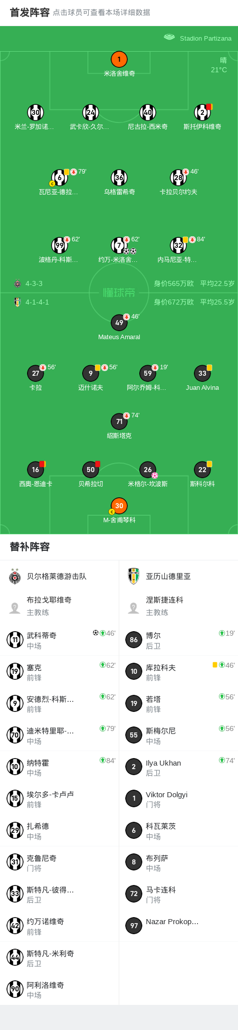 贝尔格莱德游击队4-0大胜亚历山德里亚,约万-米洛舍维奇梅开二度,武科蒂奇破门