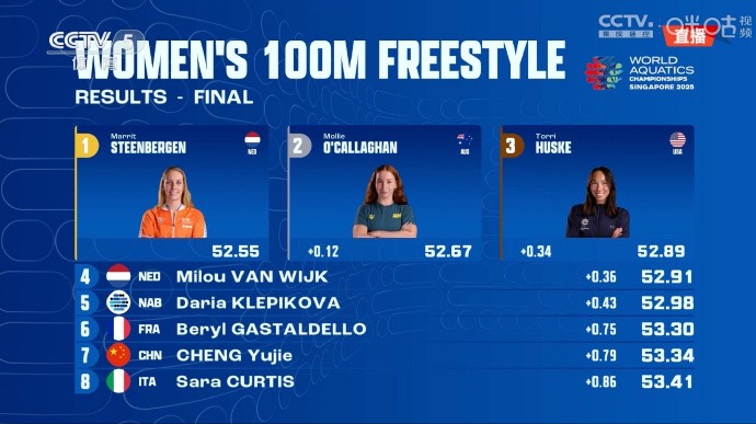 女子100米自由泳:斯滕贝亨夺冠,程玉洁获第七名gaoniu @懂球帝2025-08-01 19:25北京时间8月1日,2025世界泳联世锦赛女子100米自由泳决赛,程玉洁53.34秒排名第七,荷兰选手斯滕贝亨以52.55秒的成绩夺冠。 程玉洁,2005年9月22日出生于江西省景德镇市,中国女子游泳运动员。曾获杭州亚运会女子4×100米自由泳接力金牌、女子100米自由泳铜牌、女子4x200米自由泳接力金牌;巴黎奥运会女子4x100米自由泳接力决赛季军。展开更多