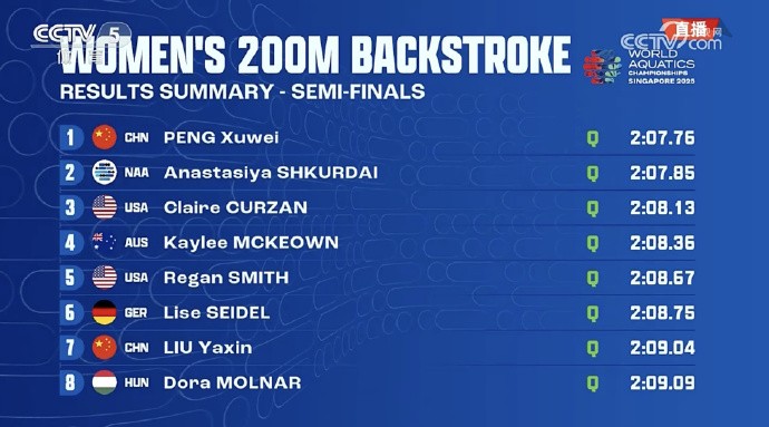 女子200米仰泳半决赛:彭旭玮总排名第一,晋级决赛gaoniu @懂球帝2025-08-01 19:38北京时间8月1日,2025世界泳联世锦赛女子200米仰泳半决赛,中国选手彭旭玮游出2:07.76,排名小组第一。与柳雅欣携手晋级决赛,后者总排名第七。彭旭玮,2003年1月15日出生于湖北麻城,国际级运动健将。曾获得第十四届全国运动会女子100米、200米仰泳金牌、全国游泳冠军赛女子200米仰泳冠军。展开更多