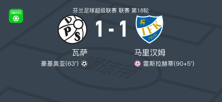 北京时间8月1日芬兰足球超级联赛 联赛 第18轮,瓦萨主场对阵马里汉姆。瓦萨豪基奥亚破门,雷斯拉赫蒂自摆乌龙。最终比分瓦萨 1-1 马里汉姆。