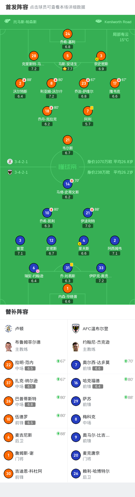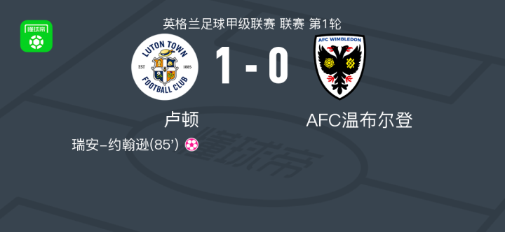 卢顿1-0AFC温布尔登战报bot @懂球帝2025-08-02 04:52北京时间8月2日,在英格兰足球甲级联赛首轮比赛中,卢顿坐镇主场迎战AFC温布尔登。比赛中,AFC温布尔登球员瑞安-约翰逊不慎自摆乌龙。凭借这一关键进球,卢顿以1-0战胜对手,取得新赛季开门红。点击查看本场比赛详细数据>>点击查看英甲完整积分榜>>精彩瞬间第85分钟,AFC温布尔登球员瑞安-约翰逊自摆乌龙。 球队阵容 技术统计 展开更多