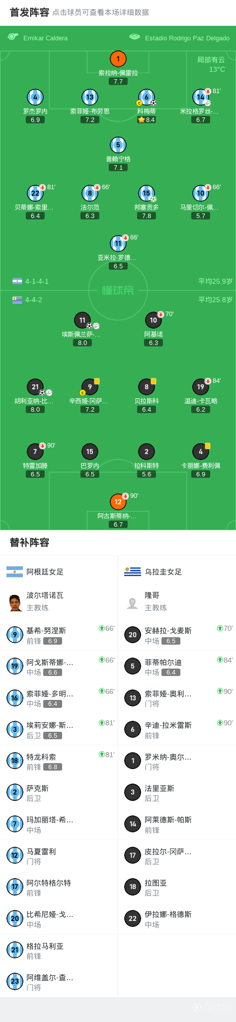 第35分钟,比埃拉助攻,皮萨罗破门扳平比分,乌拉圭女足1-1阿根廷女足