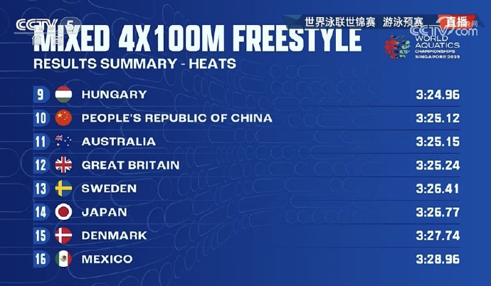 去年在多哈世锦赛该项目夺冠的中国队,在预赛游出了3分25秒12的成绩,排名小组第5和总成绩第10名,遗憾未能进入决赛。