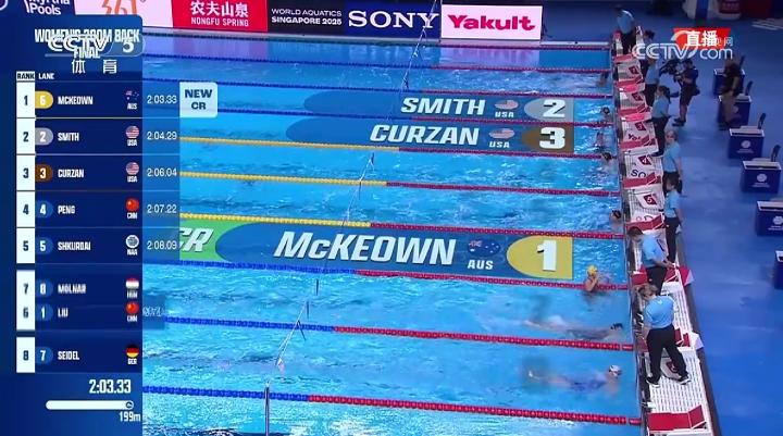 女子200米仰泳:麦基翁夺冠,彭旭玮第四、柳雅欣第六
