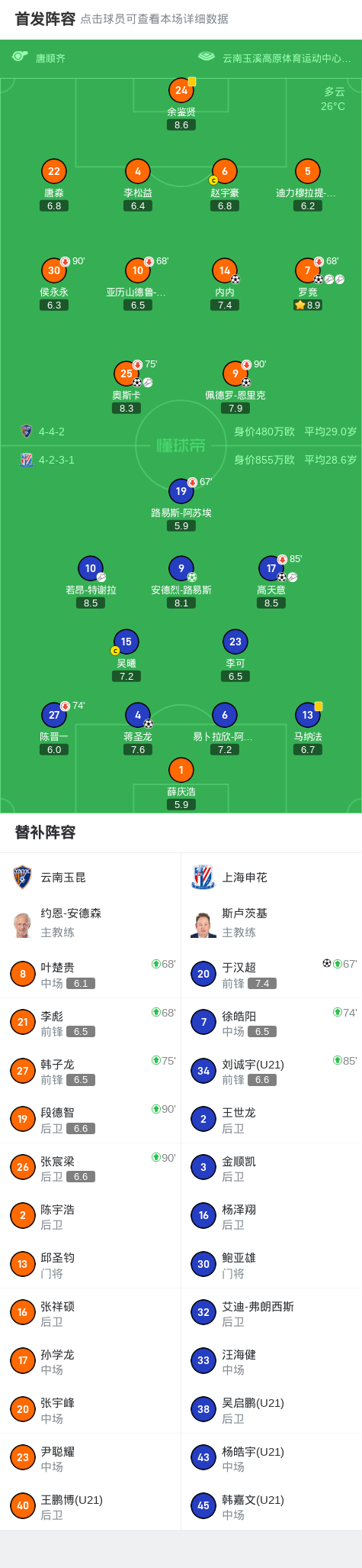 申花三球落后4-4客平云南,于汉超、路易斯连追两球,罗竞1射2传