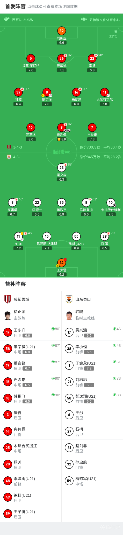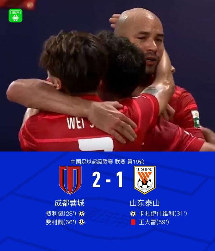 北京时间8月2日中国足球超级联赛 联赛 第19轮,成都蓉城主场对阵山东泰山。上半场费利佩扛开洛佩斯破门,卡扎伊什维利扳平比分,下半场王大雷放倒费利佩染红,费利佩梅开二度,于金永屡次救险。最终比分成都蓉城 2-1 山东泰山。