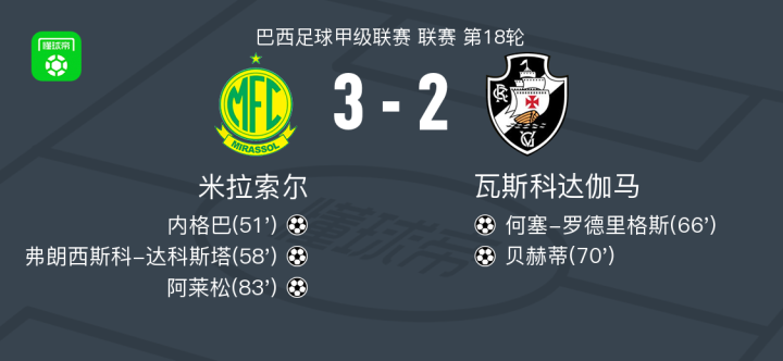 北京时间8月3日,巴西足球甲级联赛第18轮,米拉索尔坐镇主场迎战瓦斯科达伽马。比赛中,米拉索尔球员内格巴、弗朗西斯科-达科斯塔和阿莱松各入一球,为球队取得领先。瓦斯科达伽马方面,何塞-罗德里格斯和贝赫蒂也分别攻入进球,奋力追赶。全场比赛结束,米拉索尔以3比2战胜瓦斯科达伽马。