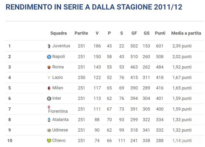 2011-12赛季至今意甲积分:尤文超600,那不勒斯罗马双雄前四
