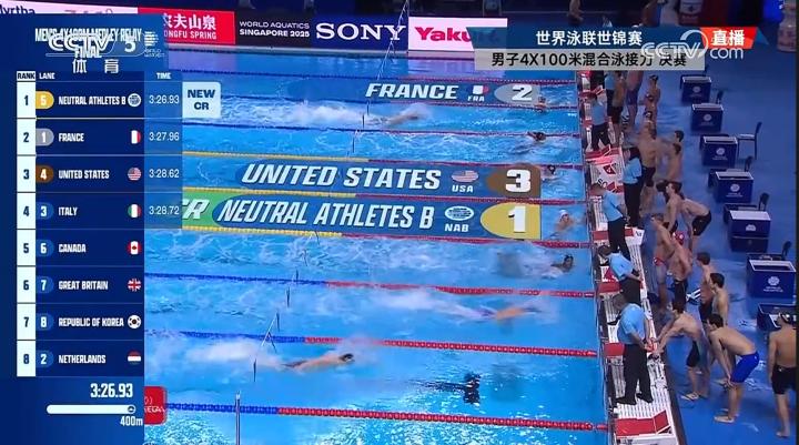 男子4X100米混合泳接力:中立运动员B队夺金,同时打破赛会纪录gaoniu @懂球帝2025-08-03 20:44北京时间8月3日,2025世界泳联世锦赛男子4X100米混合泳接力决赛,中立运动员B队以3分26秒93破赛会纪录获得金牌。法国队3分27秒96获得银牌,美国队3分28秒62摘铜。中国队预赛成绩第9,未能参赛。值得一提的是,本场美国队第4棒亚历克西发挥极其出色,接棒反应时间0.05秒,并且游出45秒95的好成绩,这与潘展乐46秒40的世界纪录已经非常接近。展开更多
