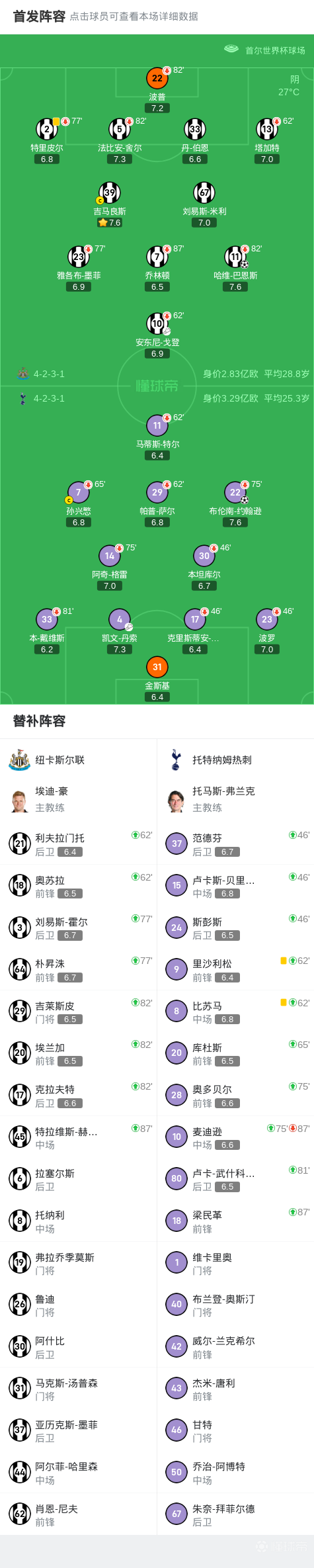 热刺1-1纽卡,孙兴慜本土告别战,布伦南、巴恩斯建功