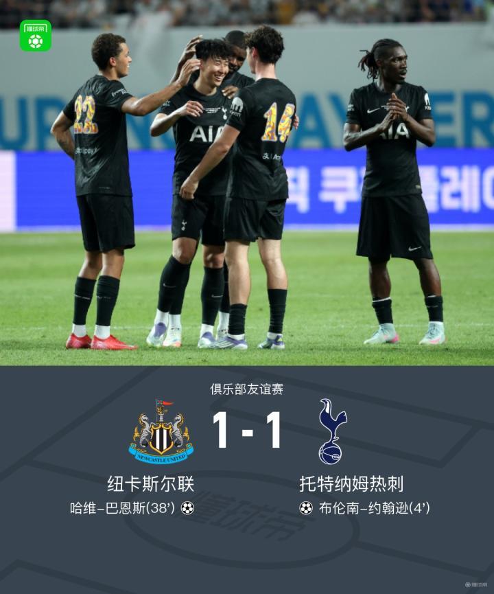 北京时间8月3日,韩国行季前赛,纽卡斯尔联与托特纳姆热刺交手。比赛第4分钟,布伦南-约翰逊率先破门,为球队取得领先。第38分钟,哈维-巴恩斯抓住机会扳平比分,第65分钟,孙兴慜被换下,完成本土告别。双方最终以1比1握手言和。