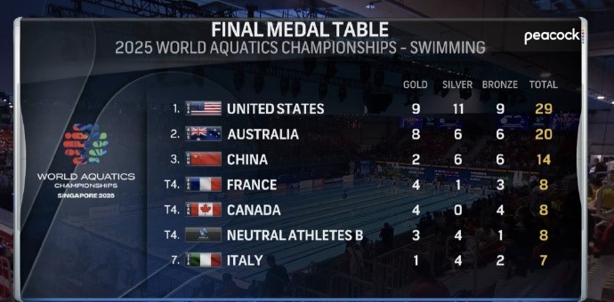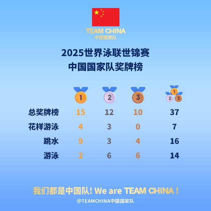 世界泳联世锦赛收官:中国队15金12银10铜,总奖牌榜第一gaoniu @懂球帝2025-08-03 21:32北京时间8月3日,2025世界泳联世锦赛的比赛全部结束,中国队位列总奖牌榜第一,总金牌榜第一。游泳项目上,中国队在本届世锦赛上的奖牌总数达到14枚(2金6银6铜),超过了上届多哈世锦赛的奖牌数,最终位居金牌榜第六名、奖牌榜第三名。美国队9金11银9铜位居榜首,澳大利亚队8金6银6铜位列第二,法国、加拿大、中立运动员B队并列奖牌榜第四。展开更多