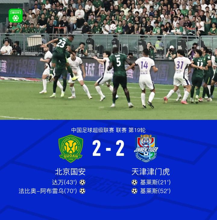 第70分钟,乃比江左脚传中,法比奥头球破门,国安2-2再度扳平津门虎