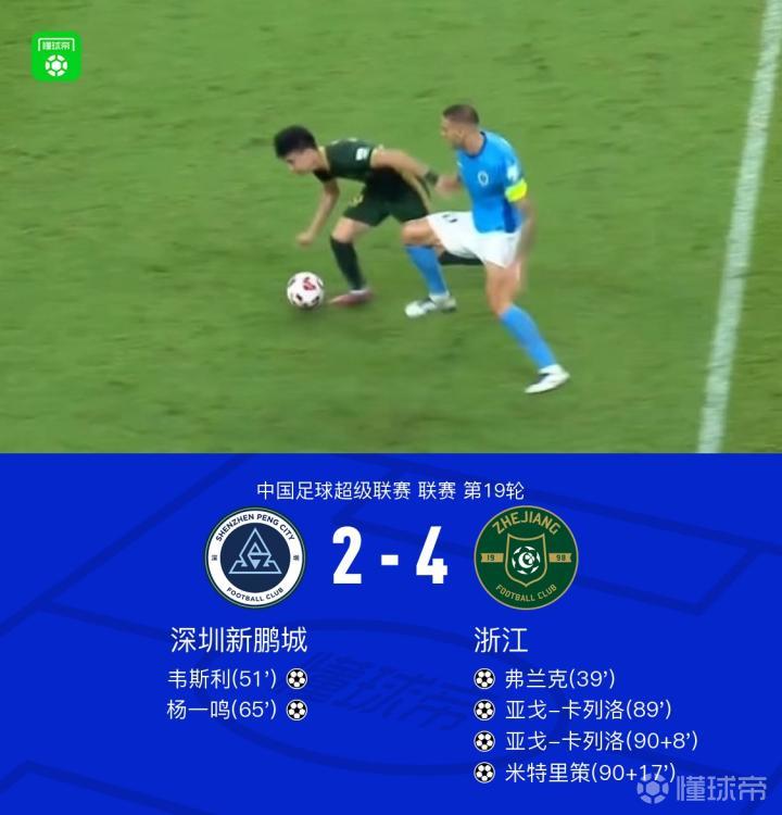 北京时间8月3日中国足球超级联赛第19轮,深圳新鹏城坐镇主场迎战浙江。比赛中,浙江球员米特里策助攻弗兰克先拔头筹。随后,深圳新鹏城球员杨一鸣送出助攻,韦斯利推射破门扳平比分。下半场,杨一鸣接廖力生妙传冷静施射反超比分。临近终场,王钰栋助攻亚戈-卡列洛破门再度扳平。补时阶段,亚戈-卡列洛接队友传球完成梅开二度,随后赵博助攻米特里策锁定胜局。最终,深圳新鹏城2-4不敌浙江。
