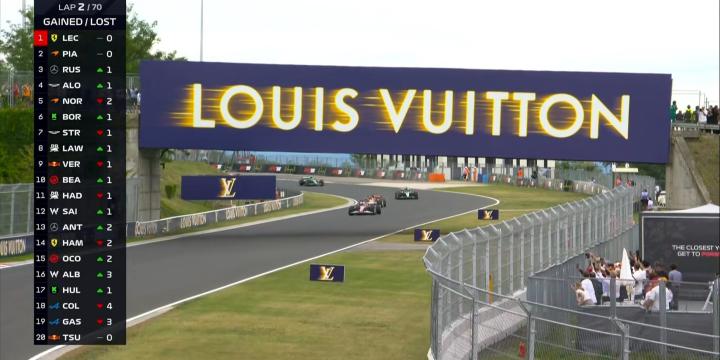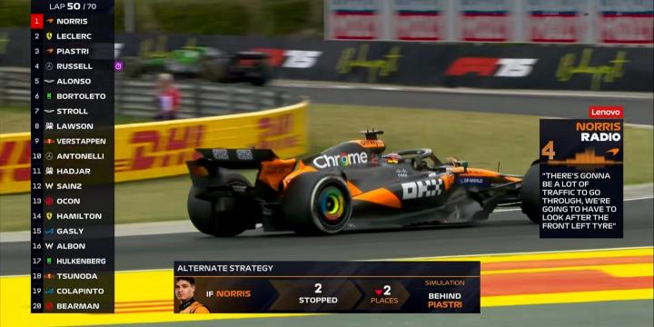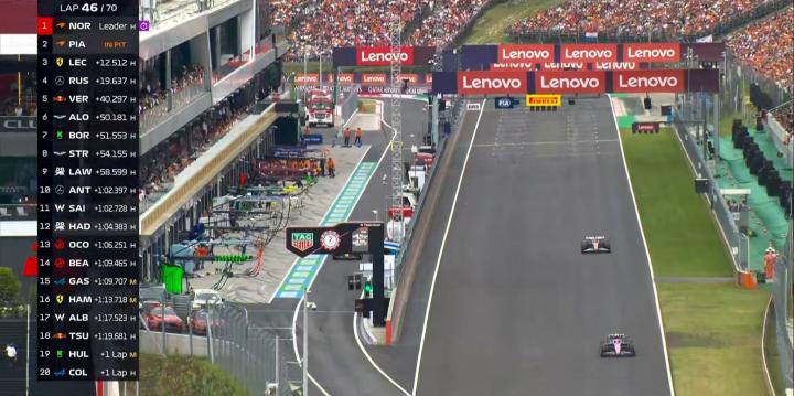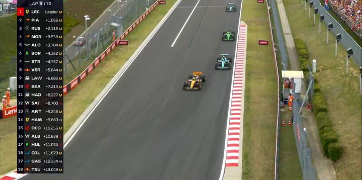 第3圈:诺里斯在1号弯前利用DRS超越斯特罗尔,上升至第4;