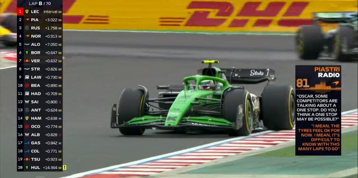 第8圈:工程师询问皮亚斯特里一停的可能性,后者表示目前剩余的圈数很多,很难现在做决定;