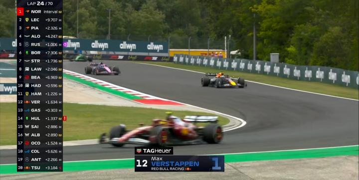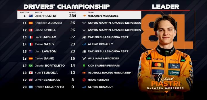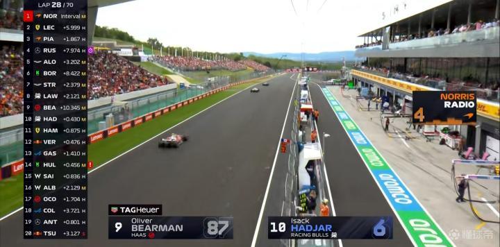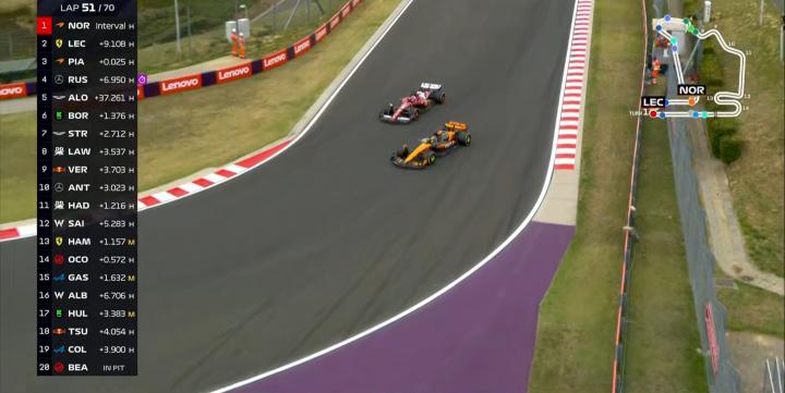 诺里斯连续丢位置,被阿隆索超越掉至第5;