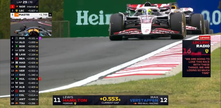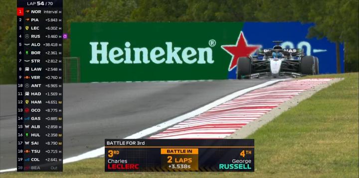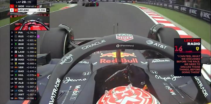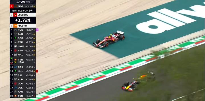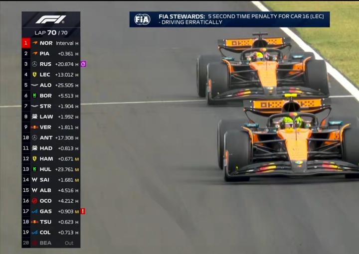 第70圈:勒克莱尔因刹车区变线被罚5秒,皮亚斯特里未能完成超越!