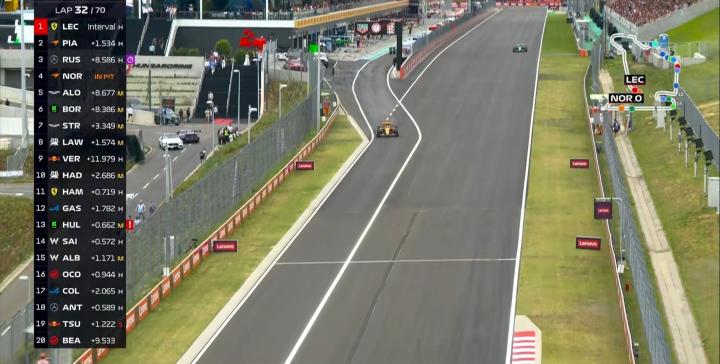 第32圈:领跑的诺里斯轮胎状况临近悬崖点,他也随即完成一停,出站后卡在阿隆索身前;