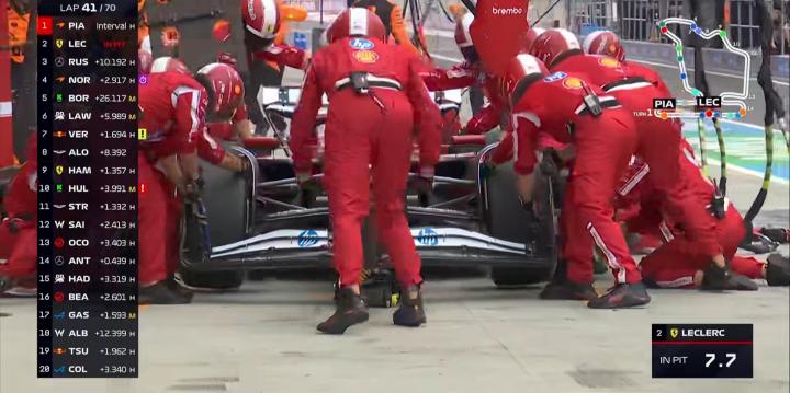 第41圈:勒克莱尔率先选择进站,避免皮亚斯特里的undercut,而这也意味着迈凯伦双车则完全可以考虑一停!