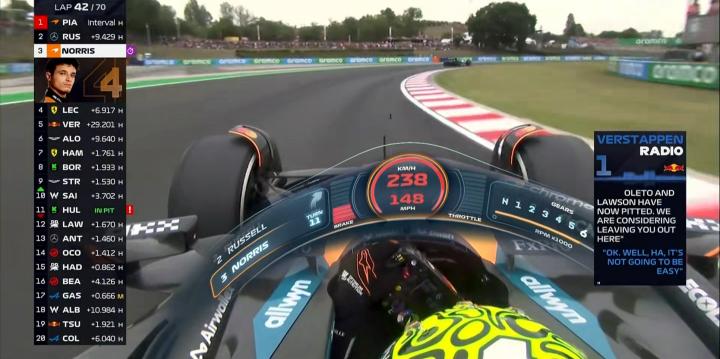 第42圈:GP告知维斯塔潘stay out,维斯塔潘则表示坚持下来将不太容易;