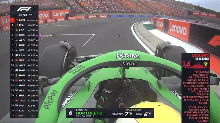 第53圈:勒克莱尔极度懊恼,他认为车队并没有执行他的策略,赛车简直没法驾驶,自己现在能上领奖台都已经是奇迹!!!