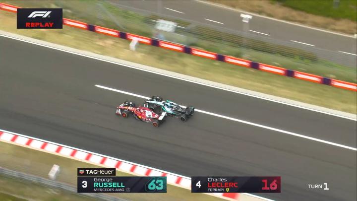 拉塞尔在1号弯前走内线强硬超越勒克莱尔,他也利用2号弯前的DRS守住了位置!