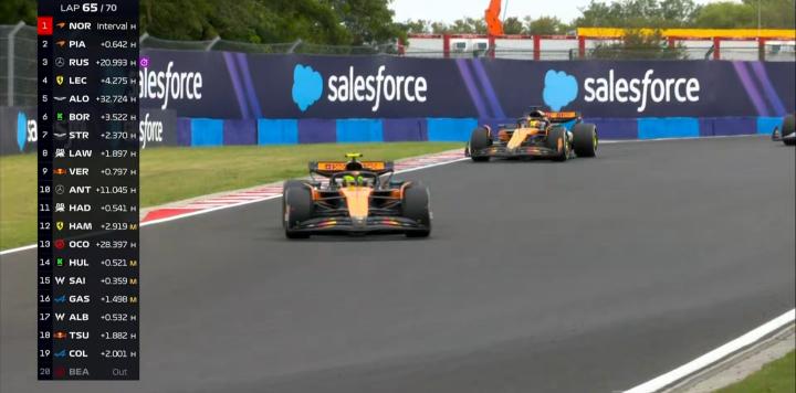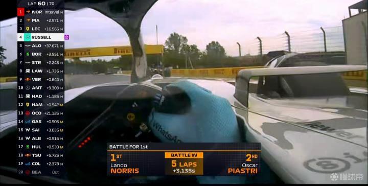 第60圈:官方预测皮亚斯特里将在5圈后来到诺里斯身后;