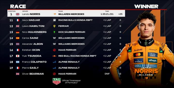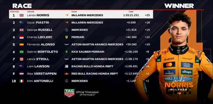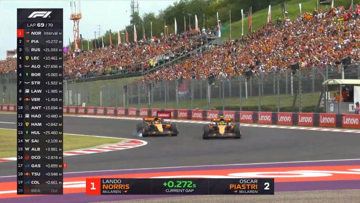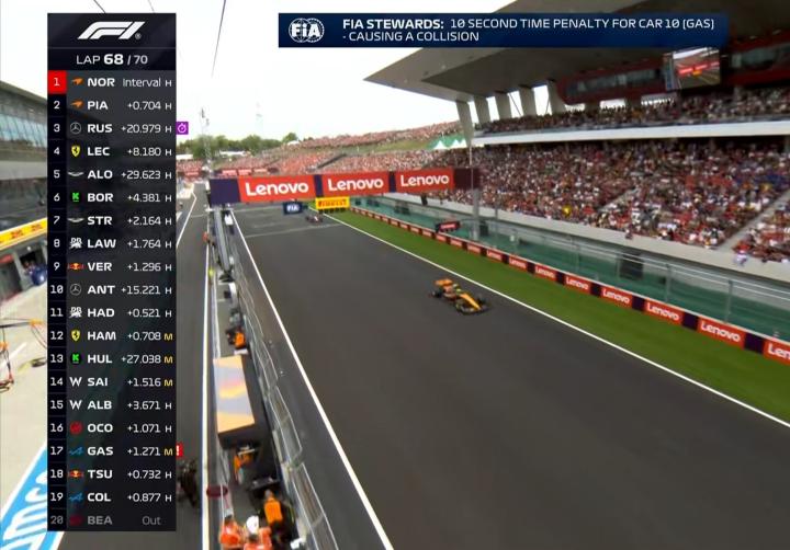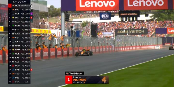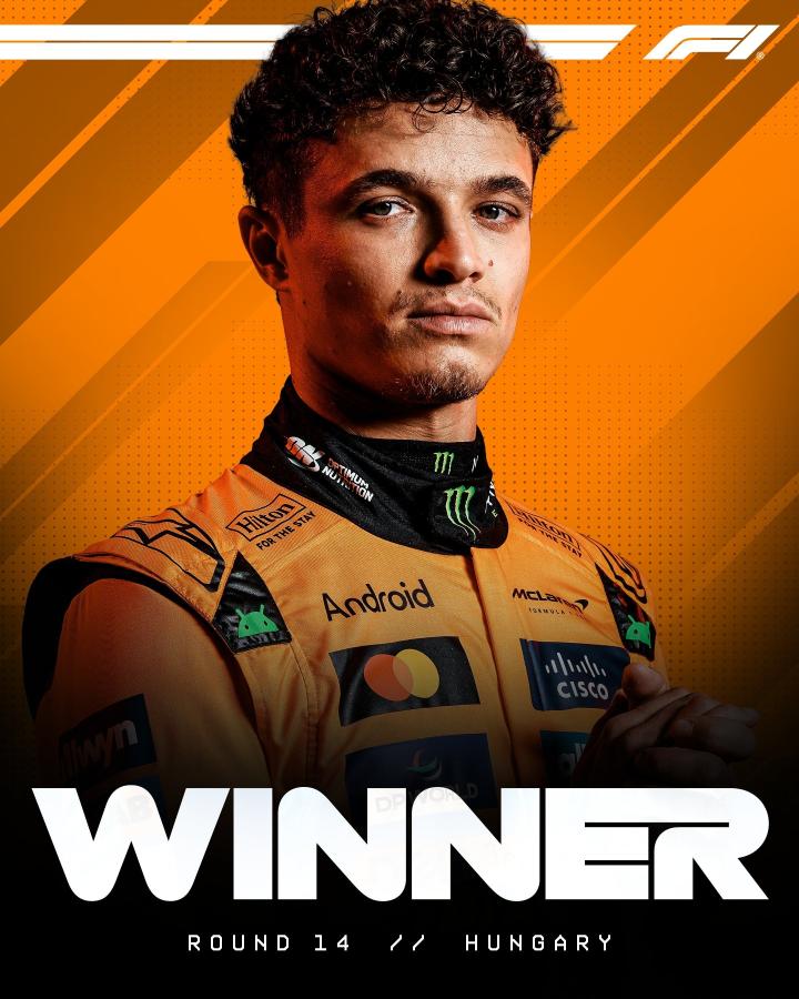 F1匈牙利站正赛:诺里斯夺冠,勒克莱尔第4,博托莱托第6