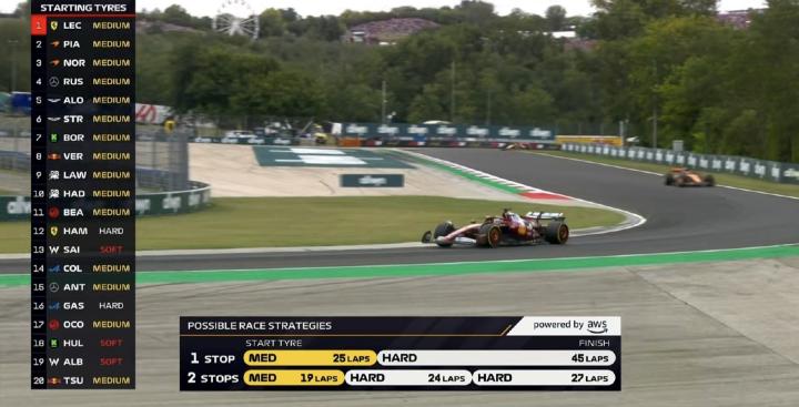 起步轮胎方面:多数车手选用中性胎,后方的塞恩斯、霍肯博格、阿尔本选用软胎,汉密尔顿、加斯利则选用硬胎;