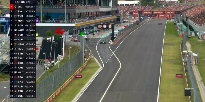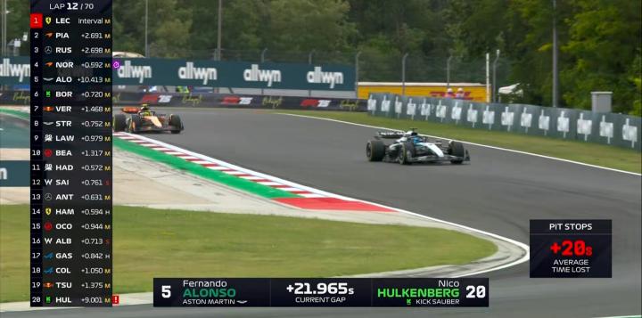 第12圈:阿隆索与完成一停的霍肯博格的差距已缩小至21.9秒,而匈牙利站的进站损失在20秒,这将对中游集团的策略制定提供参考;