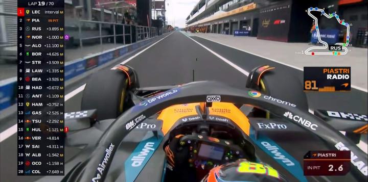 第19圈:皮亚斯特里进站一停尝试undercut勒克莱尔,出站后卡在博托莱托身前,拥有干净的窗口;