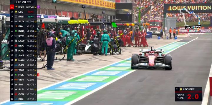 第20圈:勒克莱尔进站完成一停,2.0秒换胎出站后守住领先的位置;