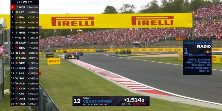 第25圈:维斯塔潘则认为车队的策略不是很好,他需要过很多辆慢车,而两台马丁并没有回应维斯塔潘的策略;