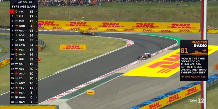 第35圈:皮亚斯特里则确认自己正常情况下要进行二停,而这样的局面将对勒克莱尔来说比较棘手;